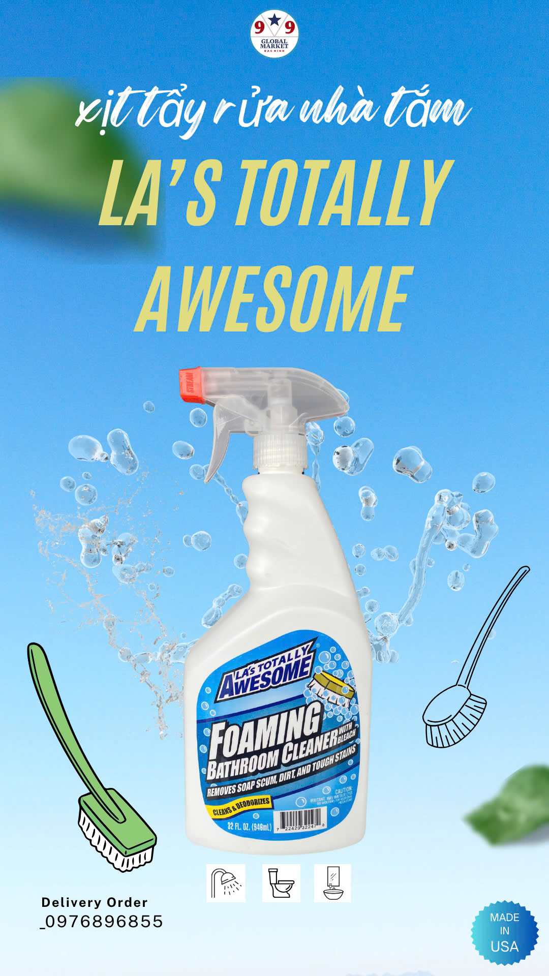 Nước tẩy rửa phòng tắm dạng bọt LA's Totally Awesome 32 oz với thành phần chất tẩy trắng mạnh mẽ là sản phẩm lý tưởng để loại bỏ các vết bẩn cứng đầu, xà phòng, mảng bám và vi khuẩn trong phòng tắm. Dạng bọt đặc biệt giúp sản phẩm dễ dàng bám dính vào các bề mặt, len lỏi vào những góc cạnh nhỏ nhất, mang lại hiệu quả làm sạch tối ưu.